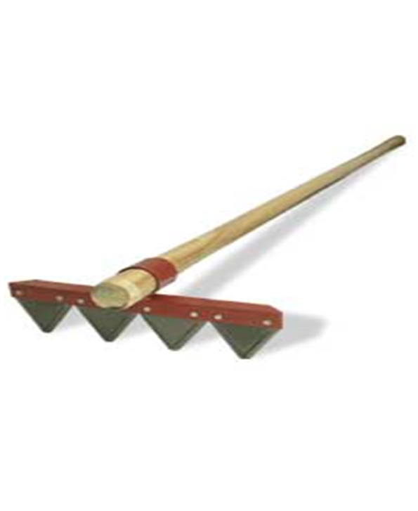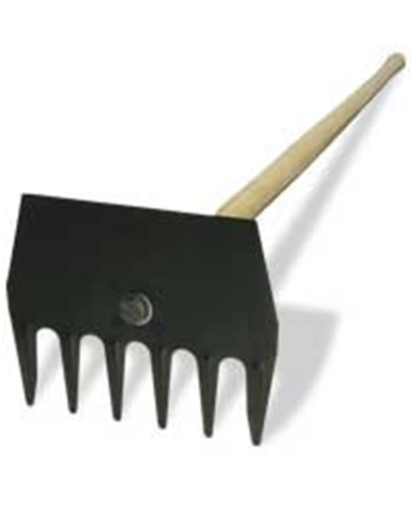 Herramienta utilizada para la limpieza forestal, eliminando los restos vegetales. Herramienta compuesta por una placa plana de acero estampado con seis dientes gruesos en un lado y corte en el opuesto. Dispone de un casquillo en su parte central para colocar un mango de madera, resistente, flexible y cónico en su zona de inserción