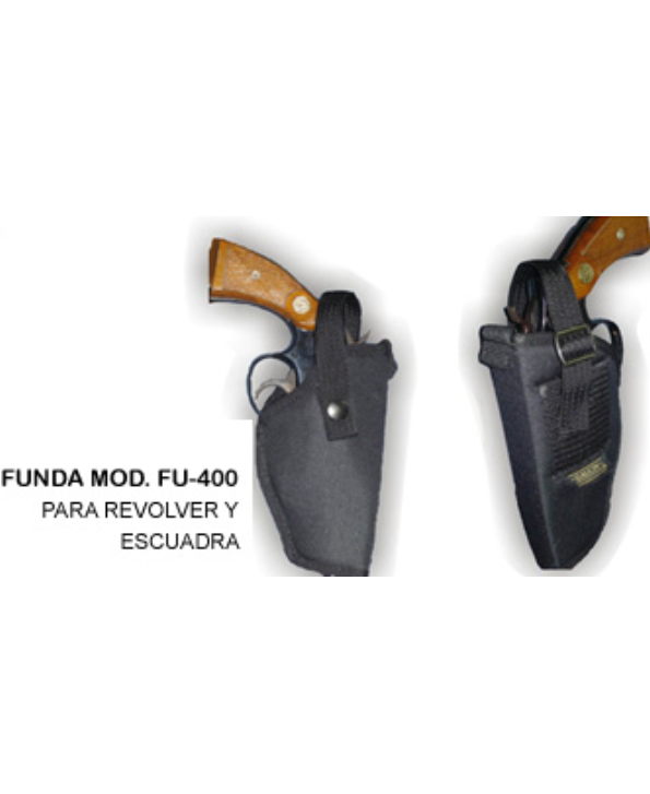 Funda para revolver FU-400. Elaborada en material moncaco forrada en su exterior con tela poliéster ribetiada en cinta nylon 3/4 en su contorno. Al interior de la funda lleva una costilla en cinta nylon de 1" para caida del arma, pasacinto de cinta nylon 2" para mayor estabilidad en fajilla, sujetador en cinta nylon de 3/4 con hebilla metalica corredisa con broche en botón para mayor ajuste del arma.